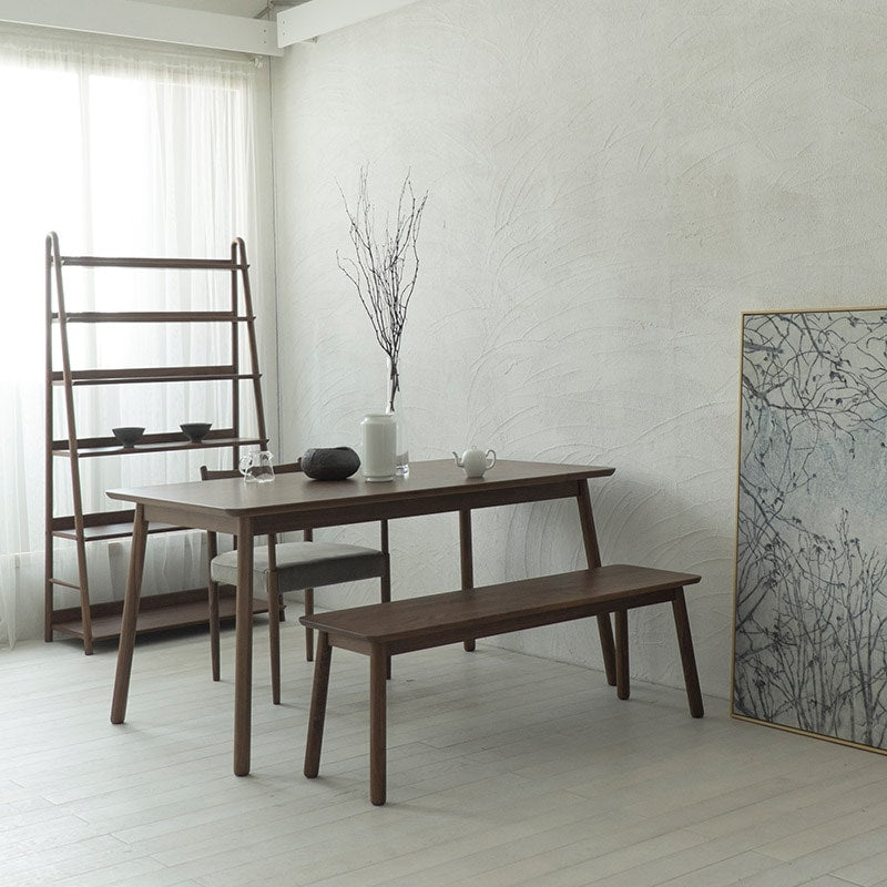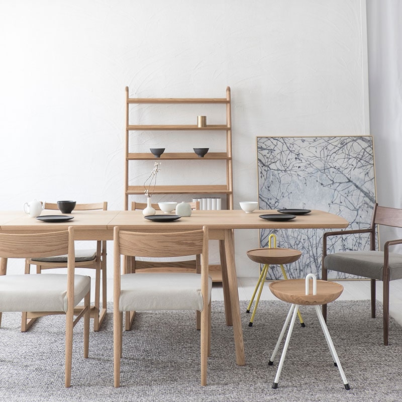 装飾的に削り過ぎず、クールに尖り過ぎず、直線を基本としながらも丸みを帯びさせた、全体的に柔らかみのあるシリーズです。全体的・部分的に先細りになった形状が空間への圧迫感を減らし、軽快さを演出しています。美観と日常の使い易さの両立を目指してデザインされました。片側伸張式のテーブルは、家族編成の変化や友人を招いてのパーティー時などに重宝します。