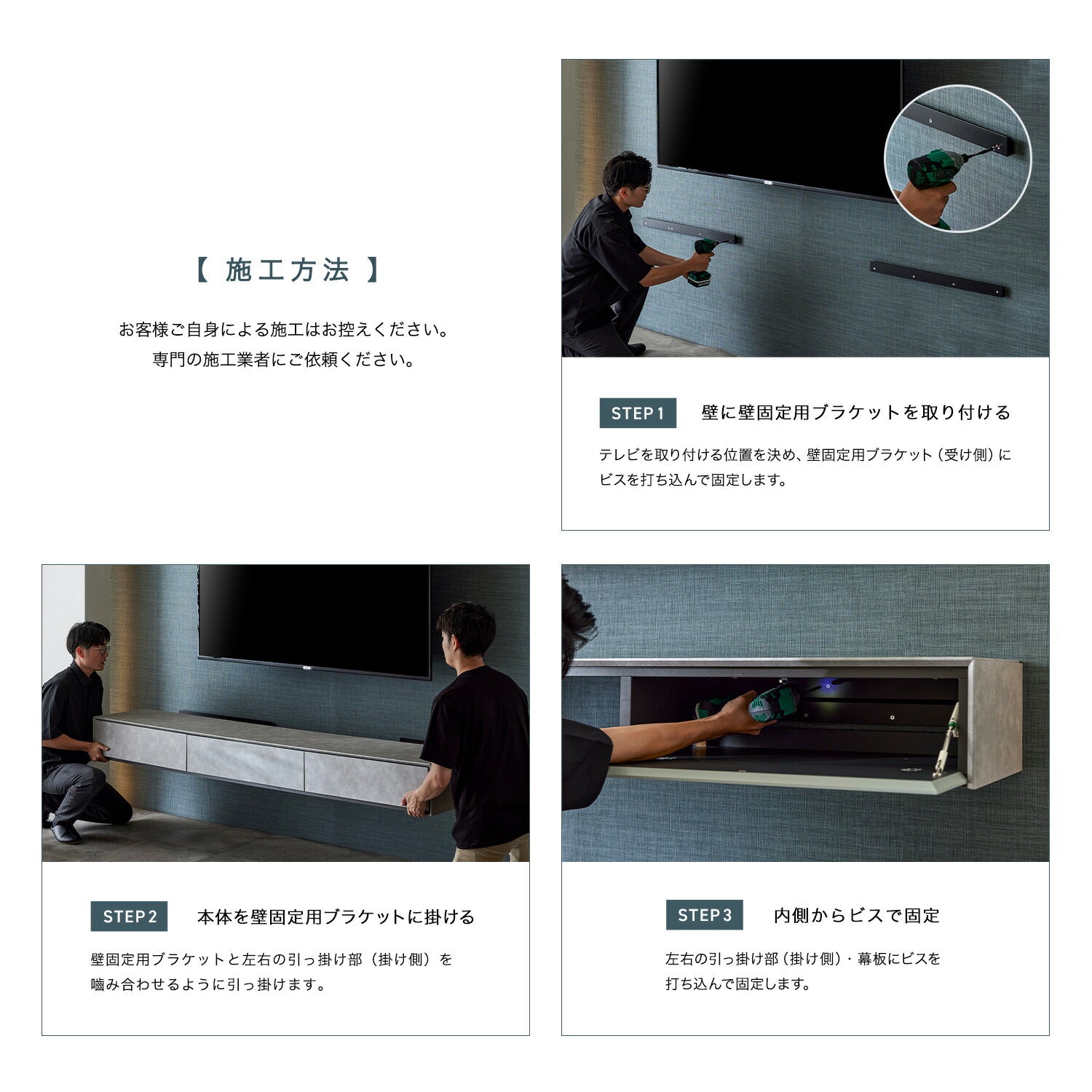 お客様ご自身による施工はお控えください。本製品は壁面に取り付ける家具のため、壁の下地確認や適切な金具の選定など、専門的な知識と技術が必要です。必ず専門の施工業者にご依頼ください。施工不良による事故や破損については、当店では責任を負いかねます。