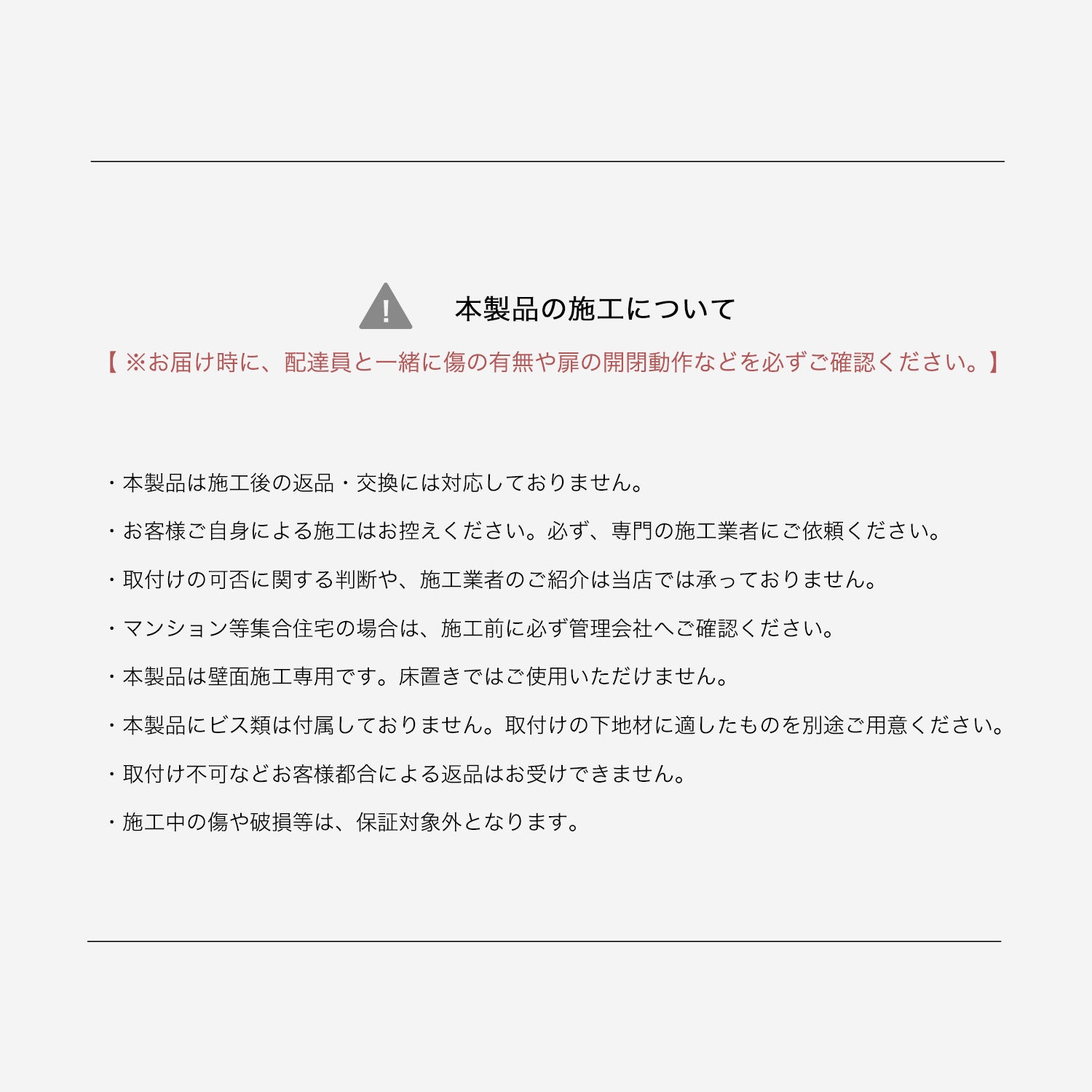 商品お届け時に、必ず搬入業者立ち会いのもとで商品の状態をご確認ください。初期不良が見つかった場合は、商品到着後7日以内に当店へご連絡をお願いいたします。施工後の交換・返品は承っておりません。