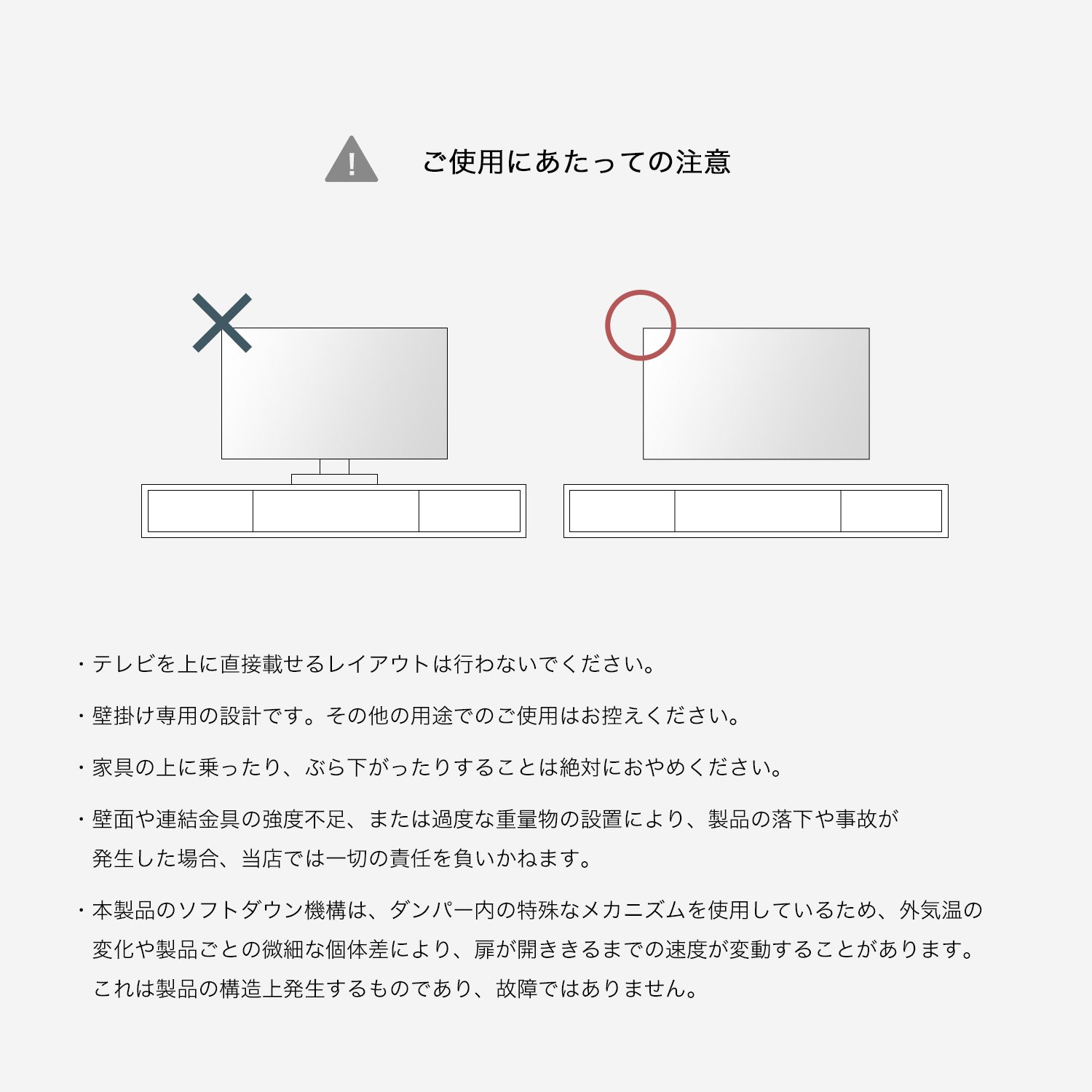 • 家具の上に乗ったり、ぶら下がったりすることは絶対におやめください。また、テレビを直接載せるレイアウトも行わないでください。