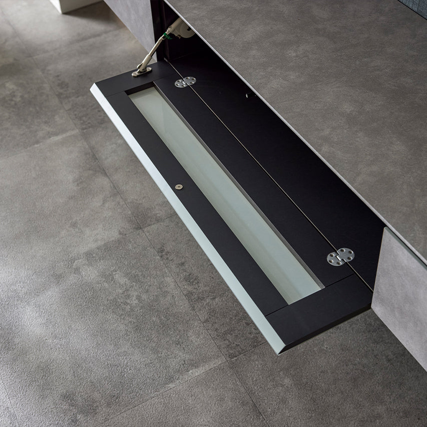 中央のフラップ扉には、完全隠蔽ガラスを採用。扉を閉めたままでもリモコン操作ができまるデザイン性と機能性を両立した仕様です。※機器の受信箇所によって、リモコン操作が難しいケースがあります。