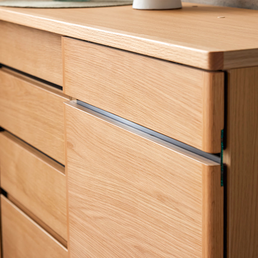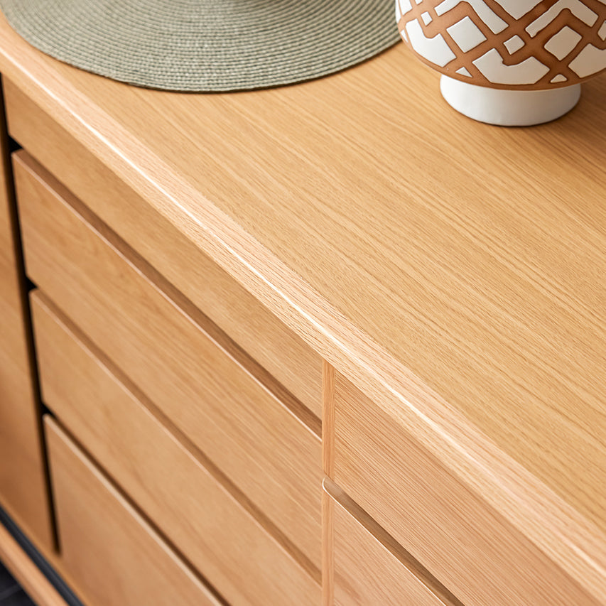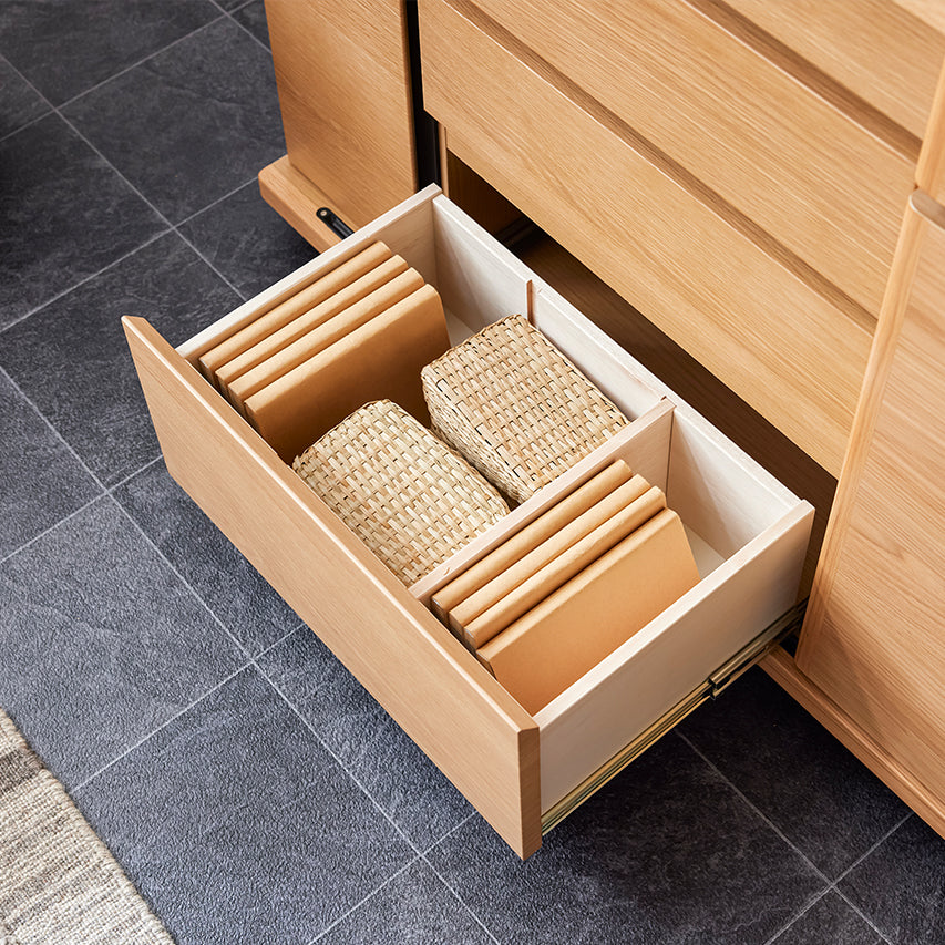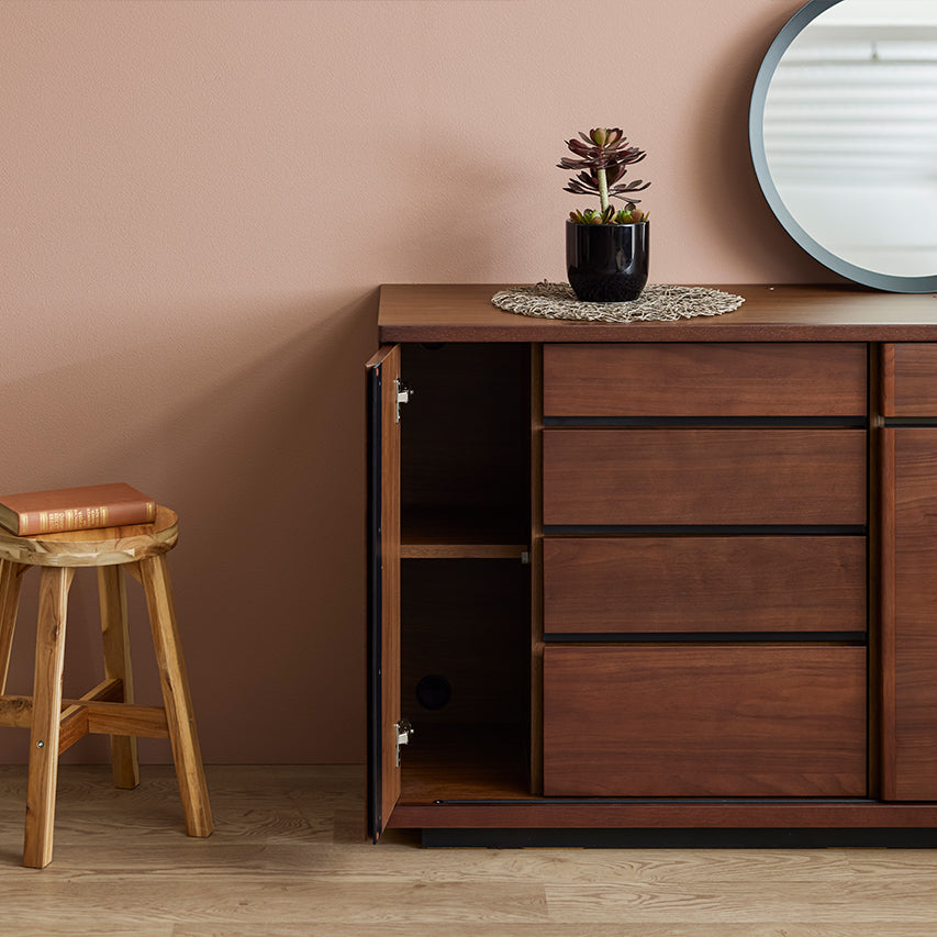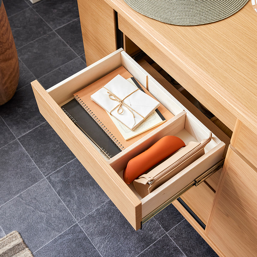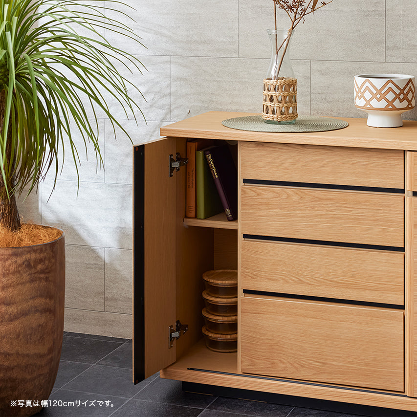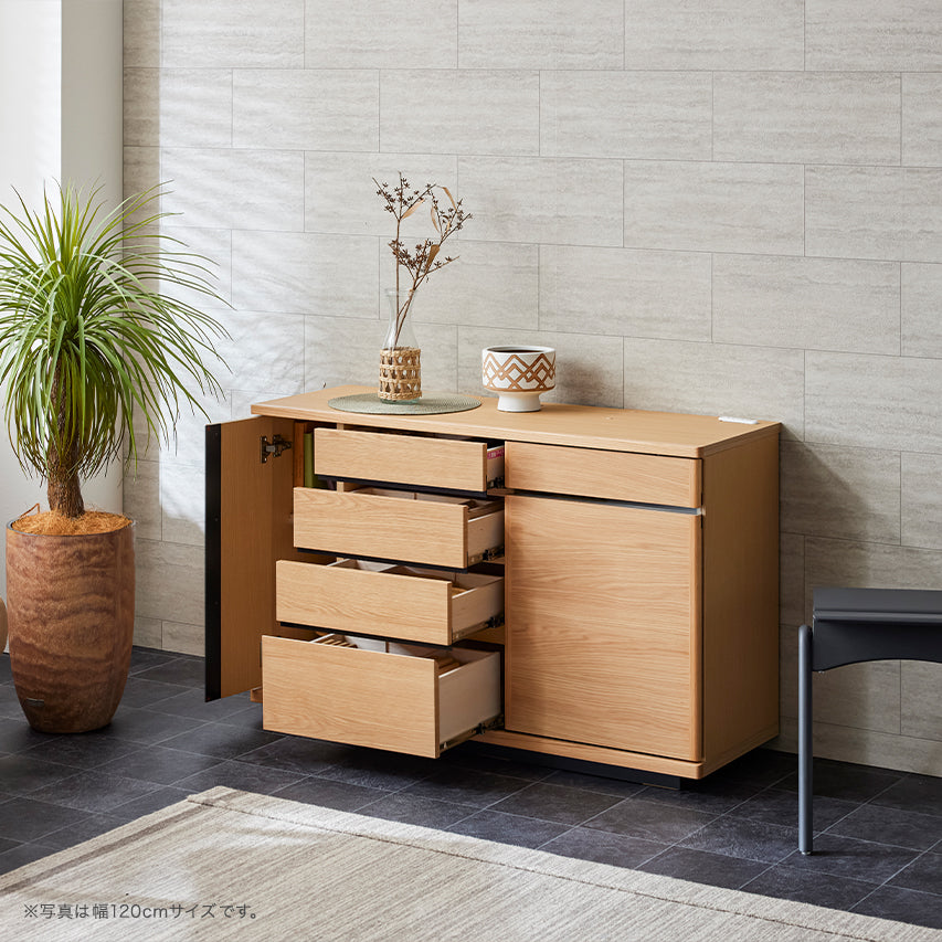 窓を塞がず自然光を取り込みつつ、天板を「日常使い」できる高さに設定しています。天板には2口コンセントを備え、スマートフォンの充電もスムーズに。収納しながら、使う・飾るを自然に楽しめる設計です。さらに、前板には突板を使用しているため、天然木の風合いを取り入れたい方にはおすすめの収納です。