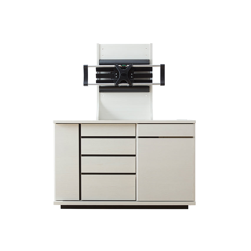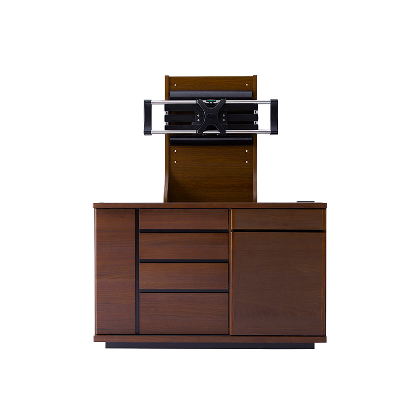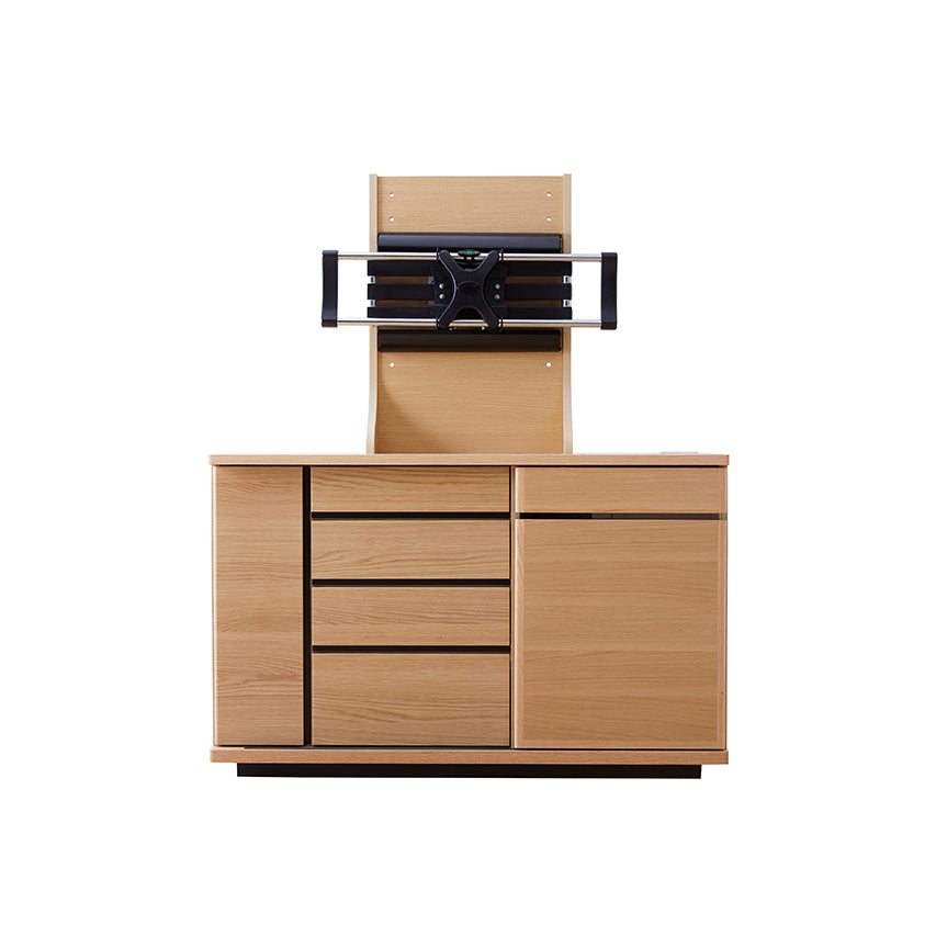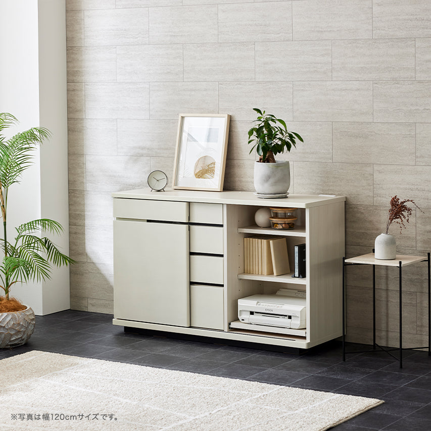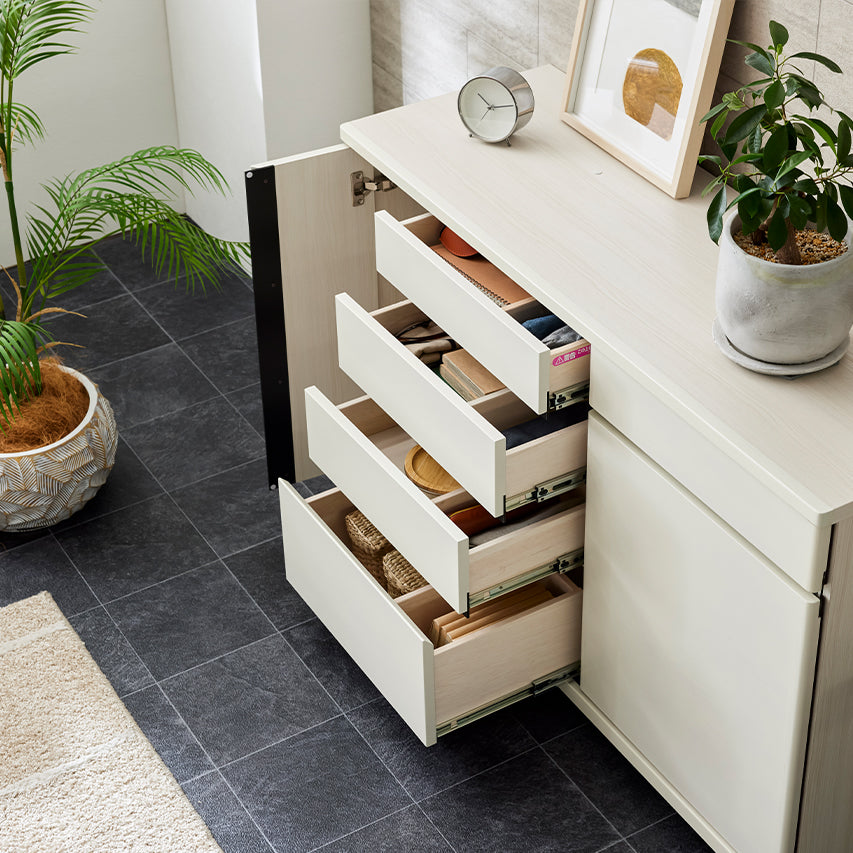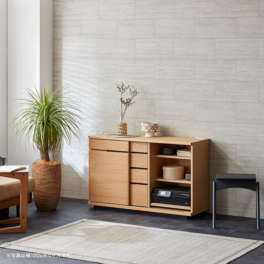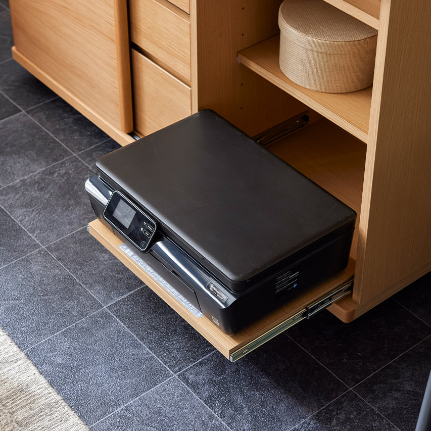 小物や書類は引き出しに、プリンターやルーター、Wi-Fi機器などは扉の中へ。内部に配線経路を設けているため、ルーターやプリンターを収納したまま使用でき、在宅ワークにも使いやすい設計です。ごちゃつきがちなアイテムをまとめて隠せるため、リビングを常に整った印象に保てます。