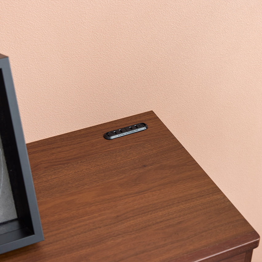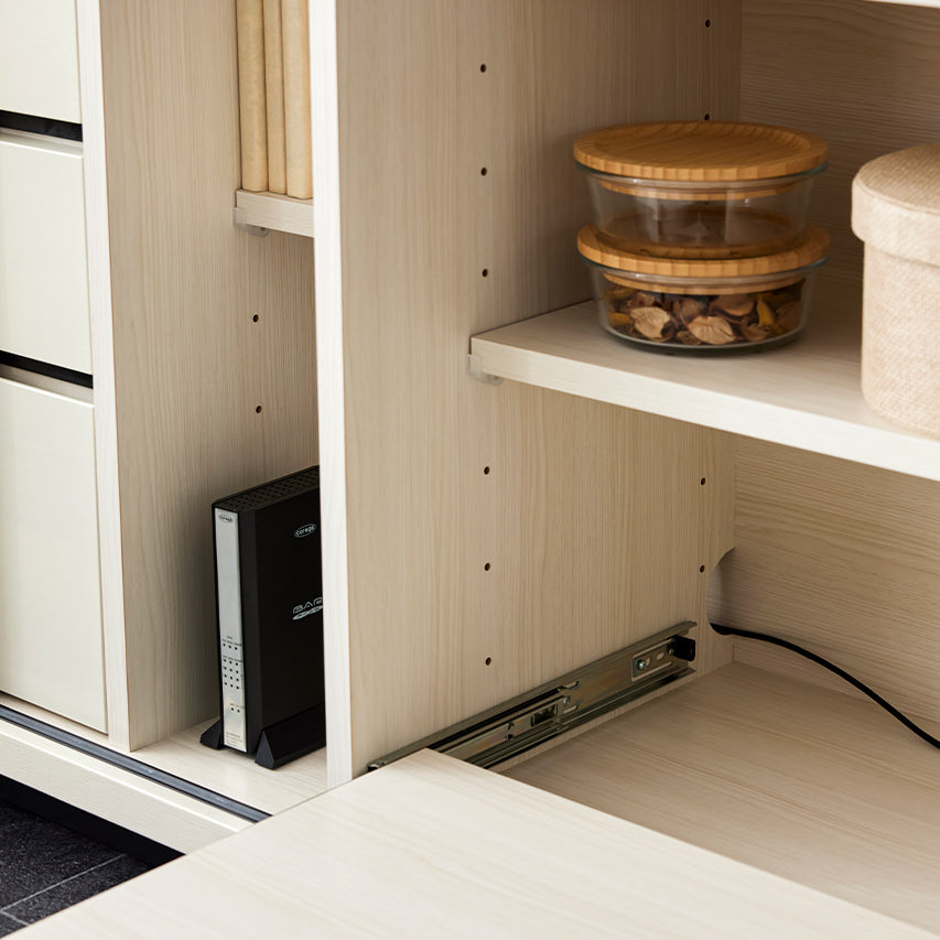 スマートフォンやPCの充電に使いやすいよう天板に設置しました。埃の侵入を防ぐスライドカバー付きで、見た目もすっきりと保てます。