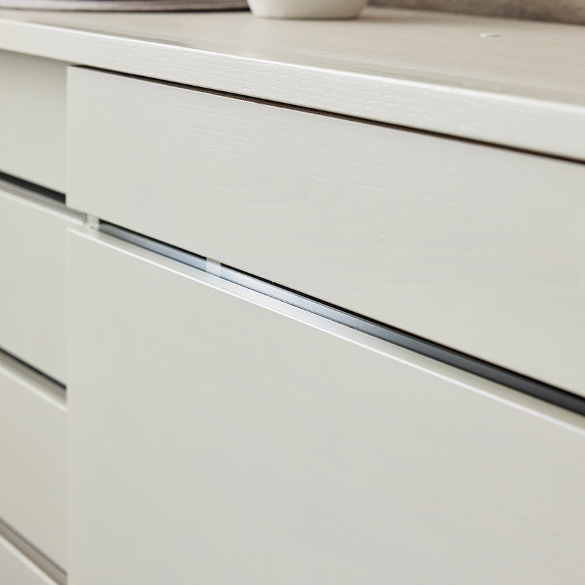 取っ手をあえて隠したフラットなデザイン。下部を彫り込んだ手掛け形状により見た目を損なうことなく、スッと引き出せます。
