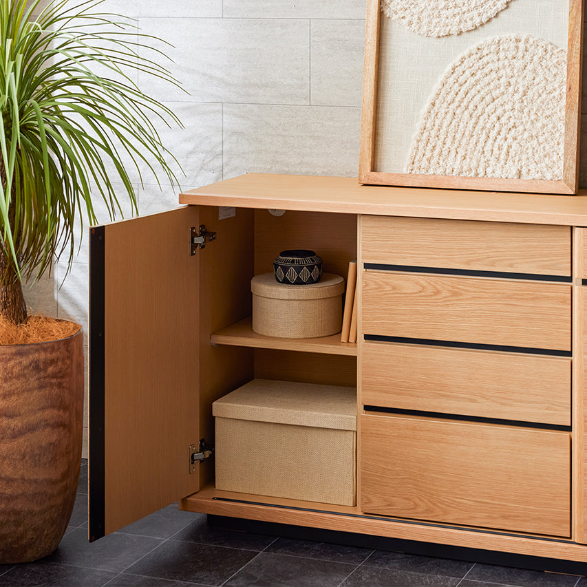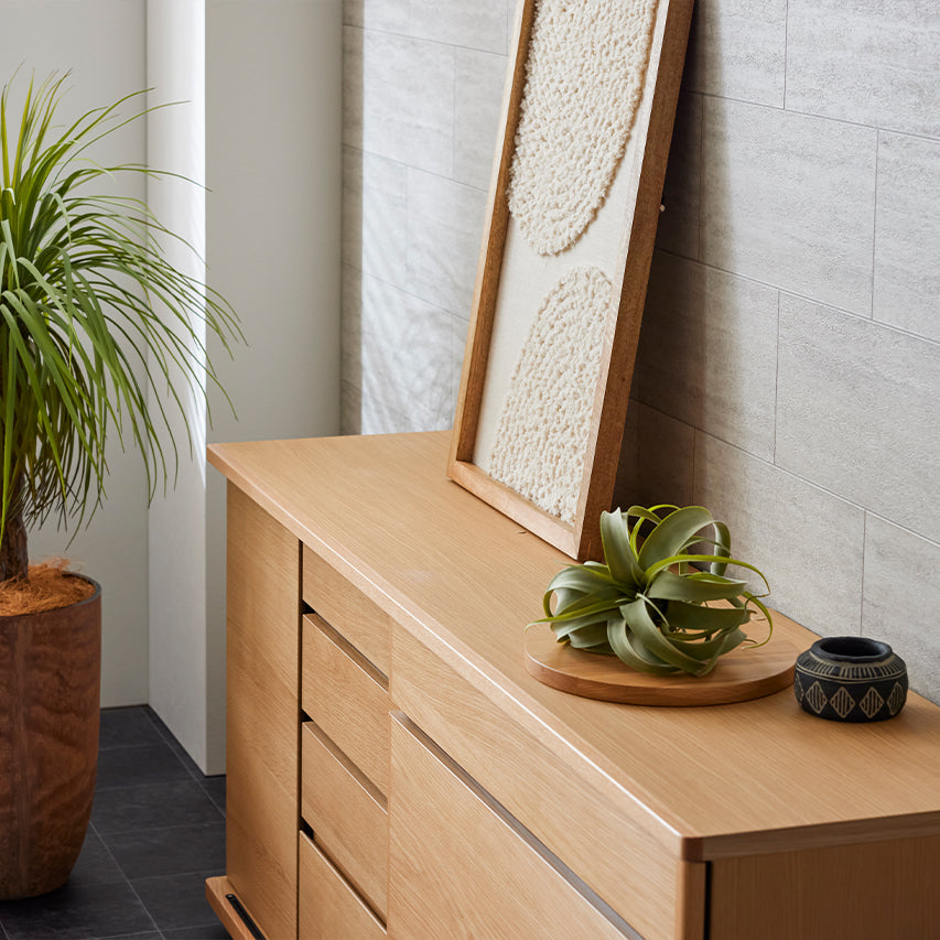 窓を塞がず自然光を取り込みつつ、天板を「日常使い」できる高さに設定しています。天板には2口コンセントを備え、スマートフォンの充電もスムーズに。収納しながら、使う・飾るを自然に楽しめる設計です。さらに、前板には突板を使用しているため、天然木の風合いを取り入れたい方にはおすすめの収納です。