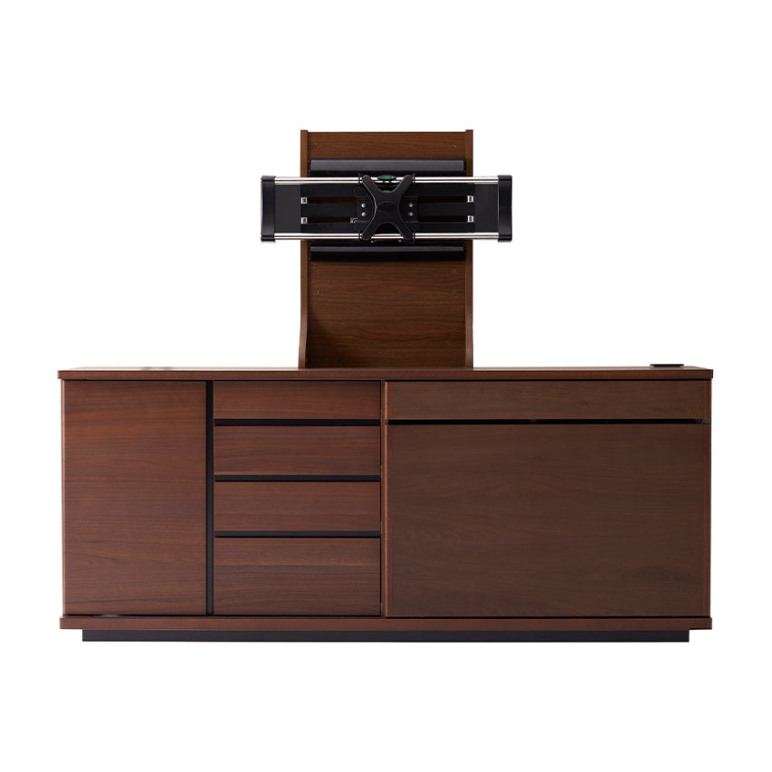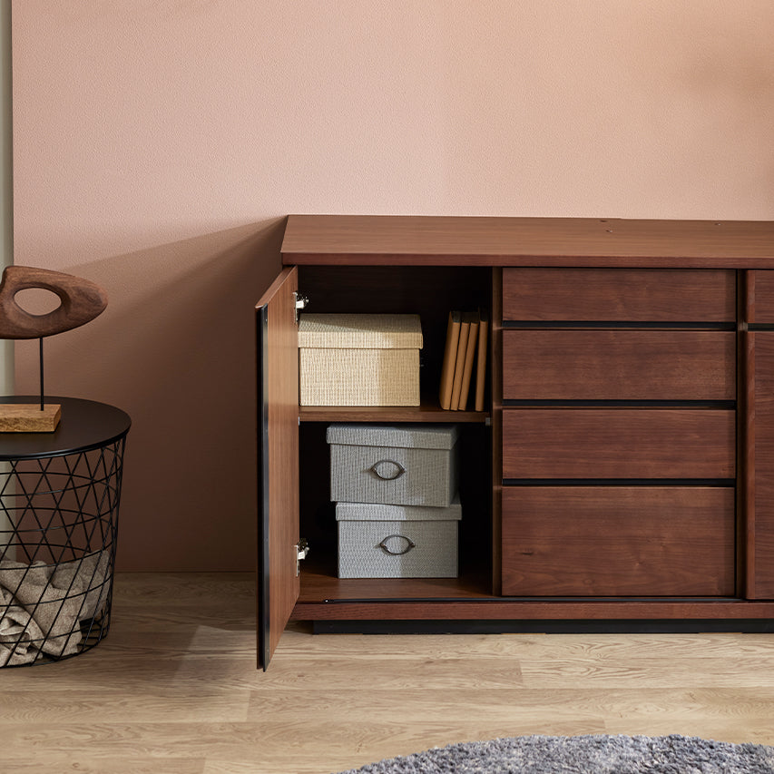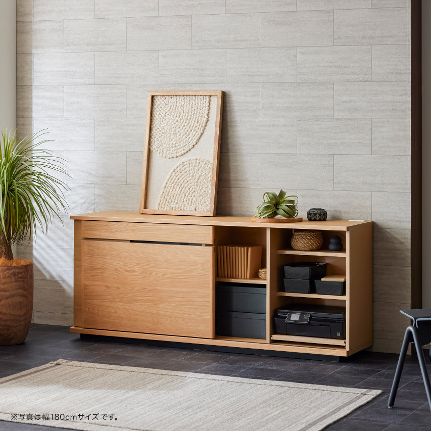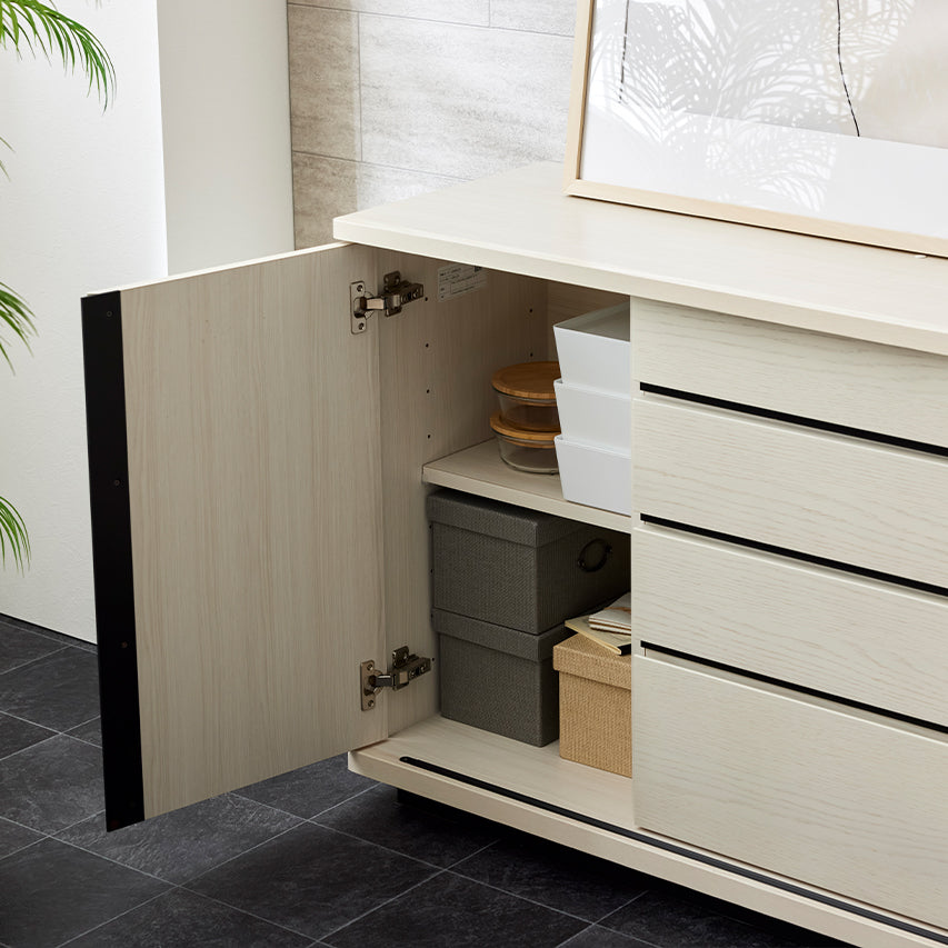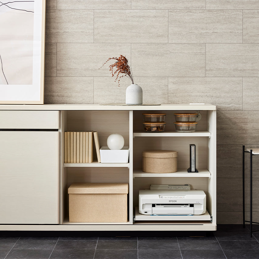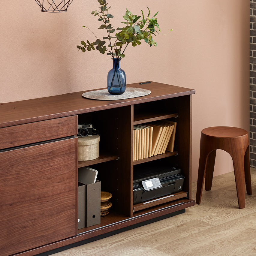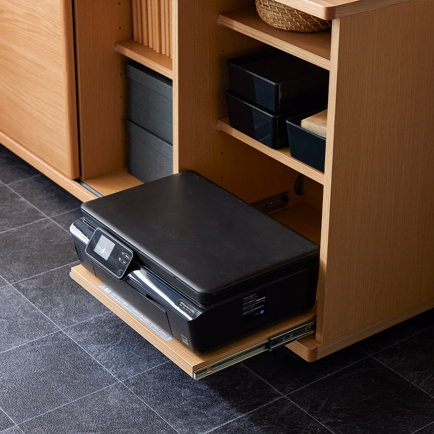 小物や書類は引き出しに、プリンターやルーター、Wi-Fi機器などは扉の中へ。内部に配線経路を設けているため、ルーターやプリンターを収納したまま使用でき、在宅ワークにも使いやすい設計です。ごちゃつきがちなアイテムをまとめて隠せるため、リビングを常に整った印象に保てます。