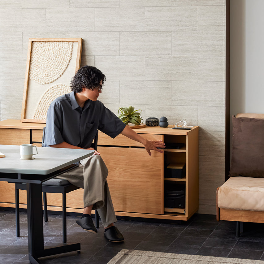 「Storage/ストレージ」最大の特長は、左右にスライドして開閉する引き戸構造。 引き戸は、扉を開けるための前方スペースを必要としないため、通路幅が限られたリビングや、椅子を引く動作が発生するダイニングスペース、人の動きが重なりやすいソファ後ろなどにも設置可能です。 家族が行き交うリビングでも動線を妨げず、ストレスのない使い心地を実現します。