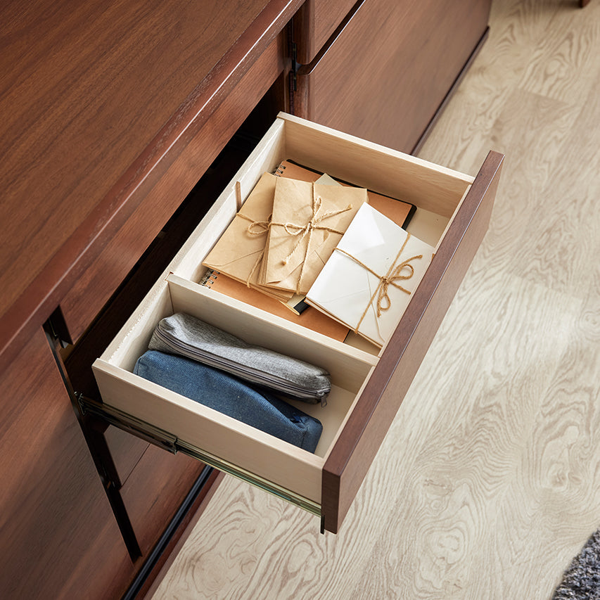 高さ違いの引き出しを4杯備え、内部には間仕切り板を設置。 細かな仕分けがしやすく、日用品や書類を効率よく整理できます。