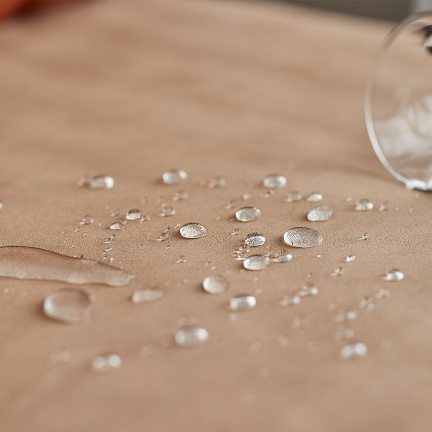 繊維の表面に透明な保護膜をつくり、飲みこぼしなどの汚れを弾きます。素材の風合いや肌ざわりはそのままなので、違和感なく取り入れられます。